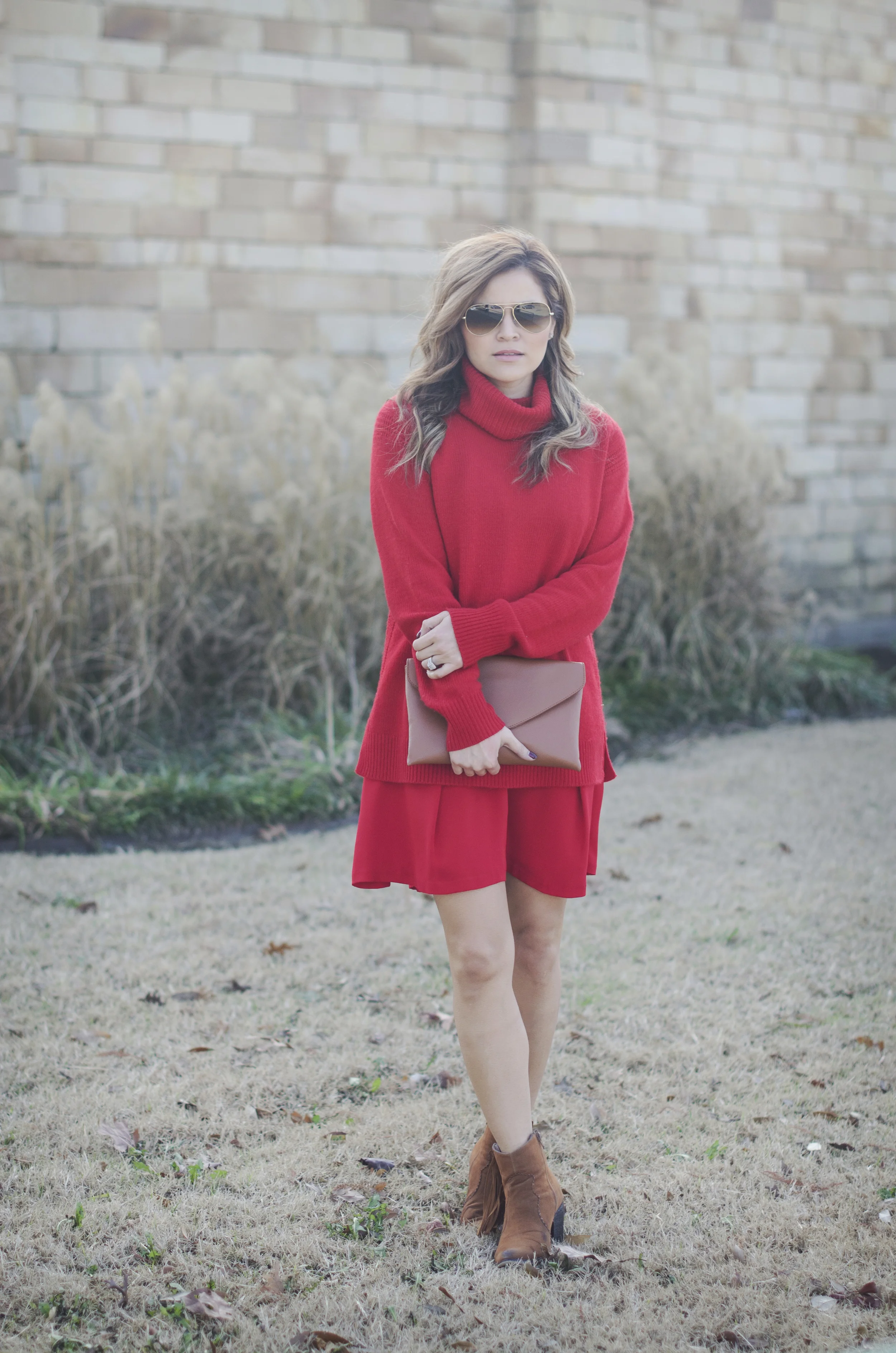 Dress: S.I.C. Couture, old (not really similar but red) | Sweater: J.Crew | Boots: Bucco, old (similar) | Clutch: J. Crew | Sunnies: Ray-ban | Lips: Stila "Olivia"
