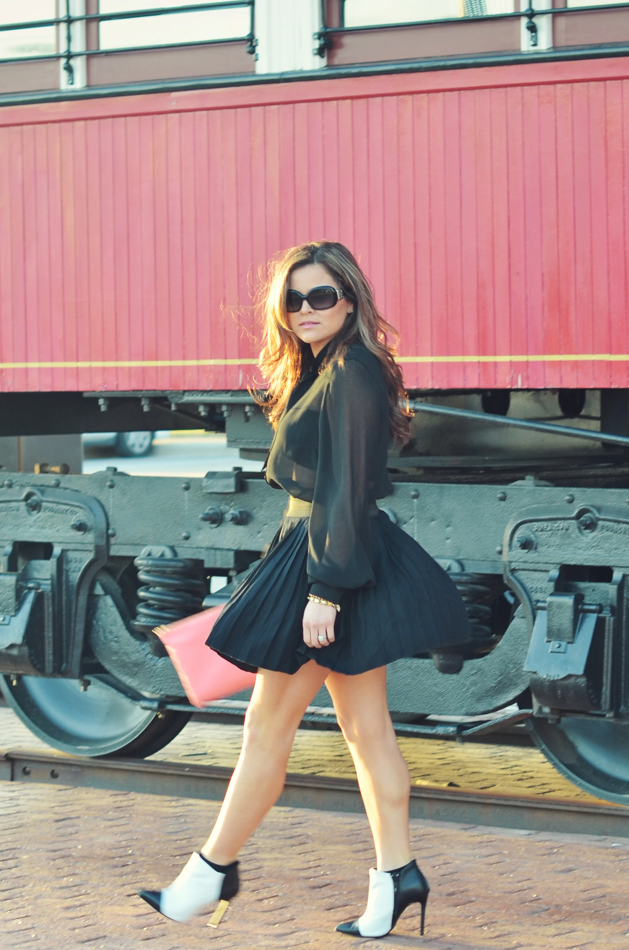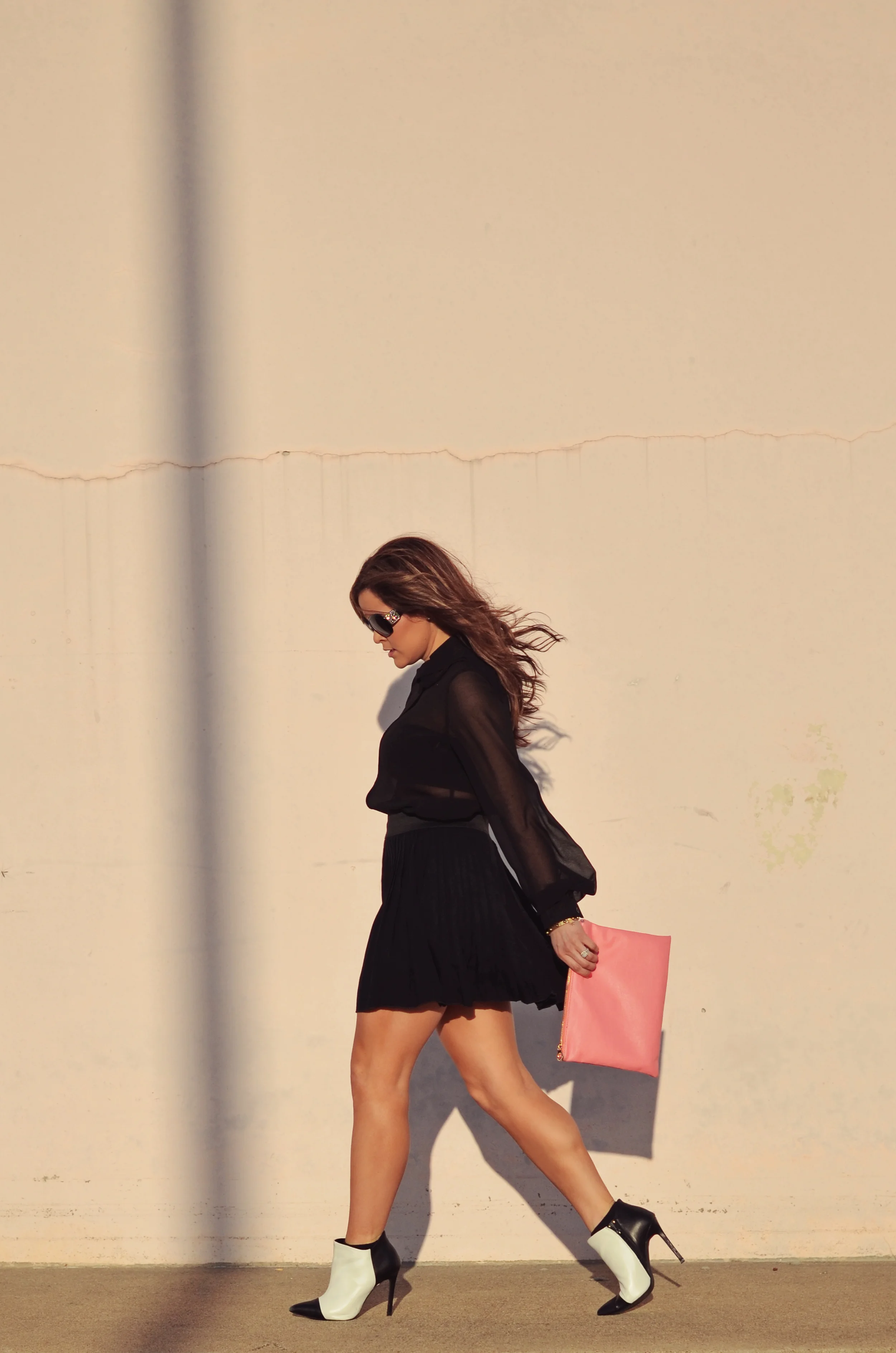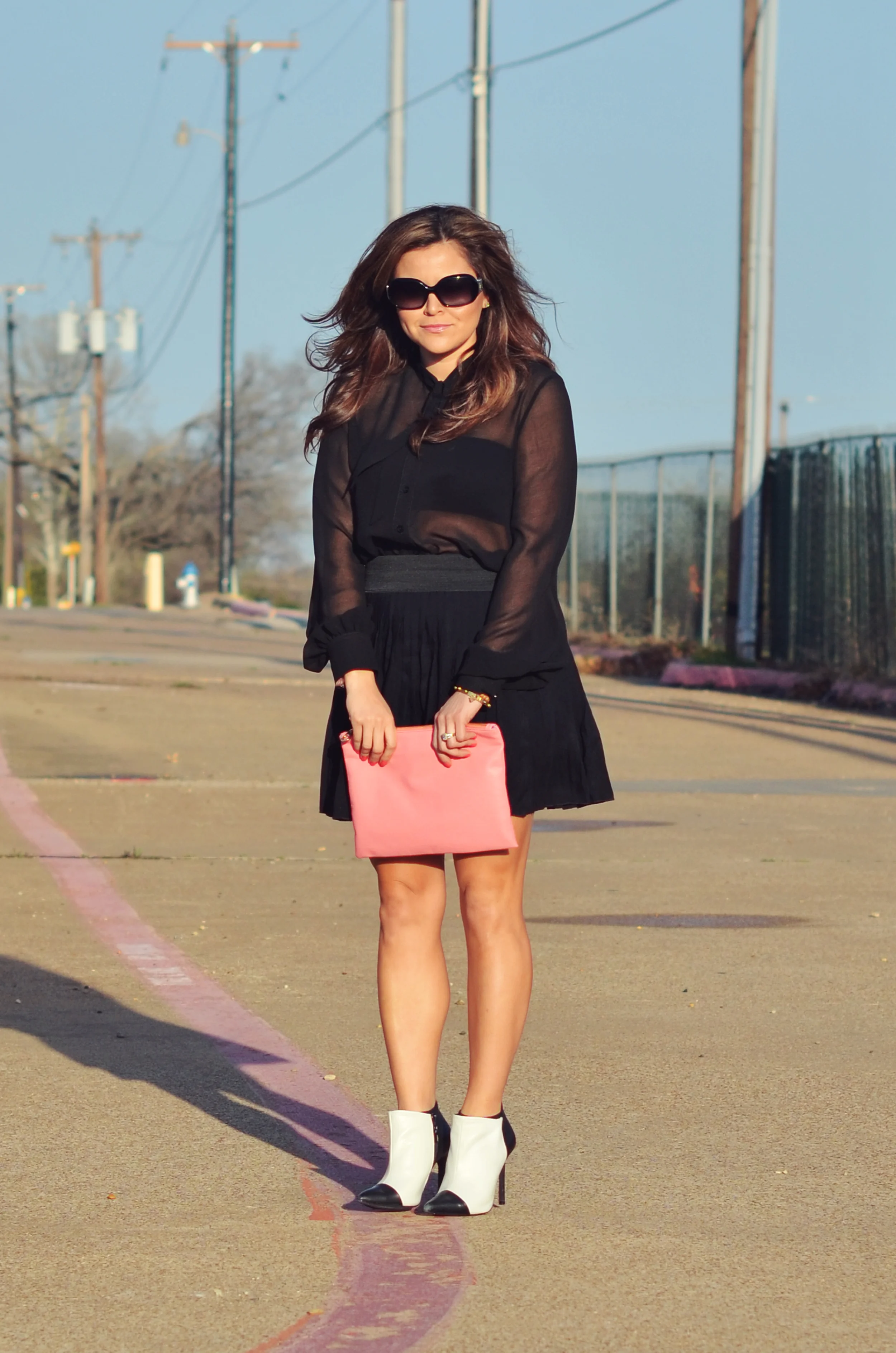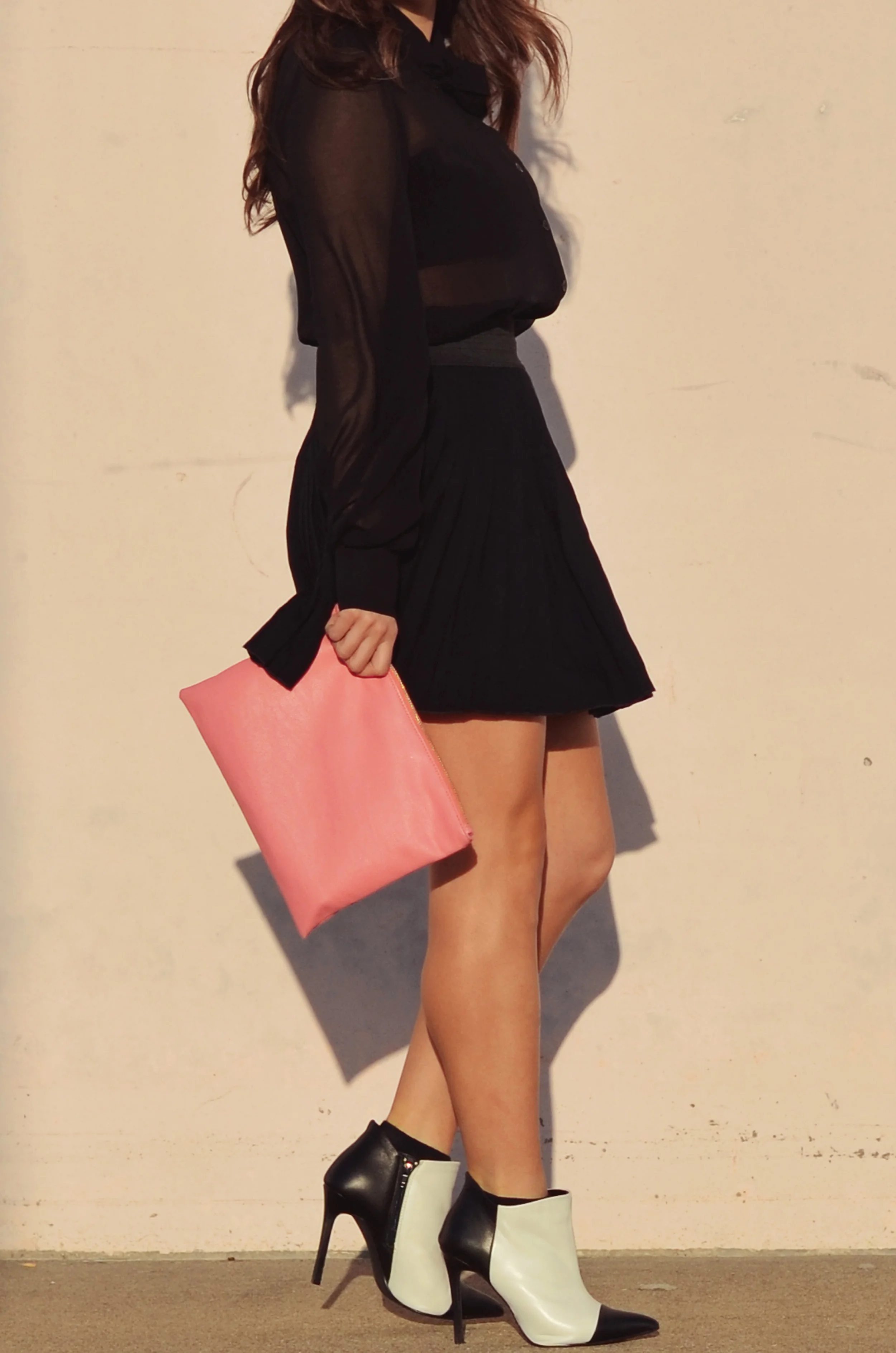 This outfit makes me feel glamorous but still classic, dressed in black with a pop of baby pink. You can never go wrong with the basics. The blouse is pretty sheer so I added a bandeau or you can add a cami if you are feeling a bit more reserved. It's a great blouse to have in your closet all year around.