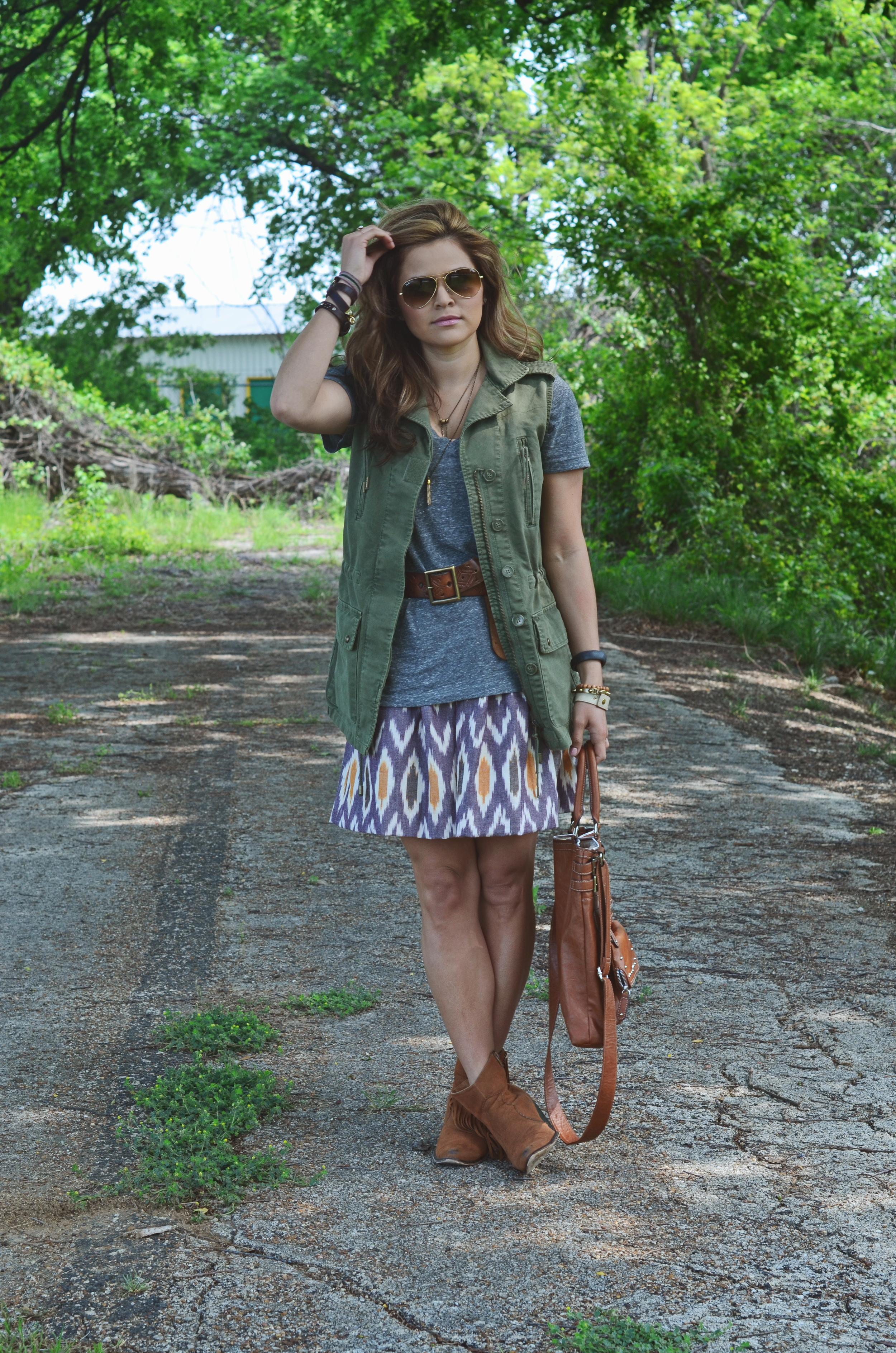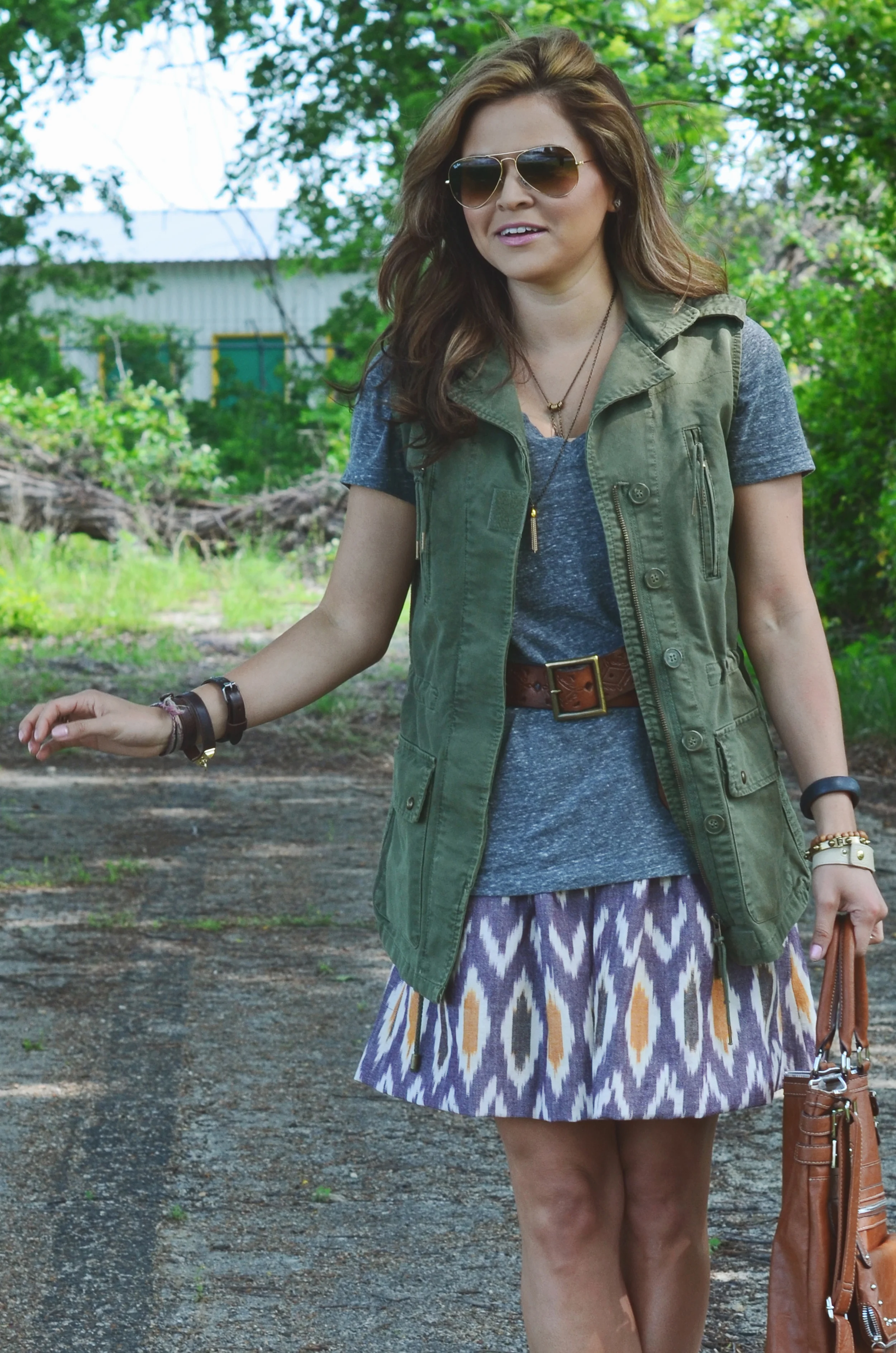 Hello, there! Let me first explain about this vest: I had been looking for a safari vest for months and when I finally found this gem, I didn't even hesitate to buy it. It was exactly what I was looking for - the color, the length, the pockets...the price tag. SO I mixed it this ikat skirt with a simple gray tee ( I live for this tee - I've gone thru a few). I think the army green gives the purple skirt a nice compliment. Fyi, this skirt is about an inch and half longer than what you see in these pictures but I shorten it cause....well, I'm short. I hemmed it with a loose whip stitch so if I want to make it longer in the future than it'll be easy for me to take it back to the original length. Right now, this skirt is on sale and you can get an extra $20 off with code: EZRA - such a steal being the original price tag was....um, $119.