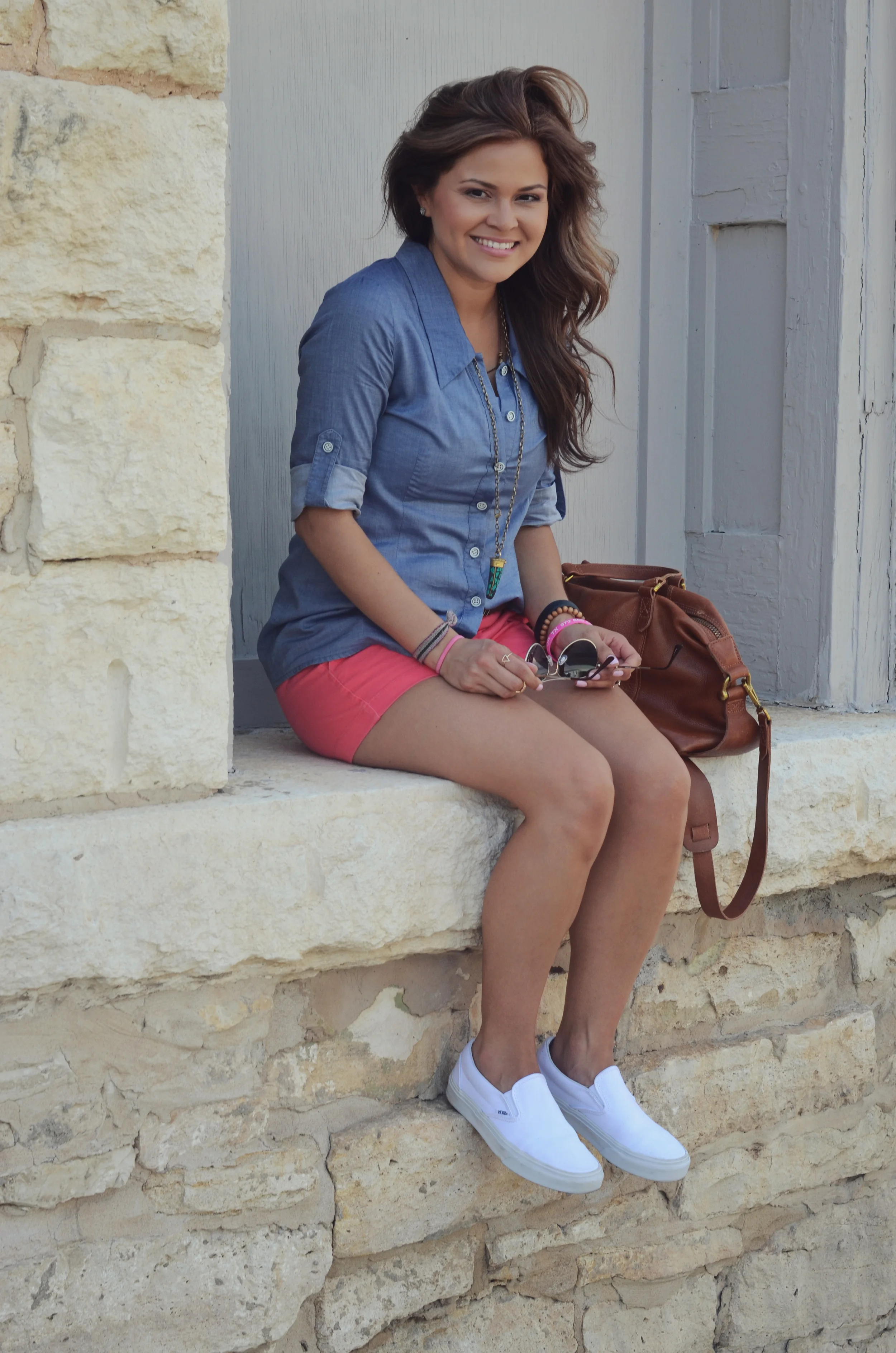 Button up: S.I.C. Couture | Shorts: J.Crew | Shoes: Vans | Bag: Madewell | Belt: A&F | Necklace: Jewelmint | Sunnies: Borrowed from my sister :)