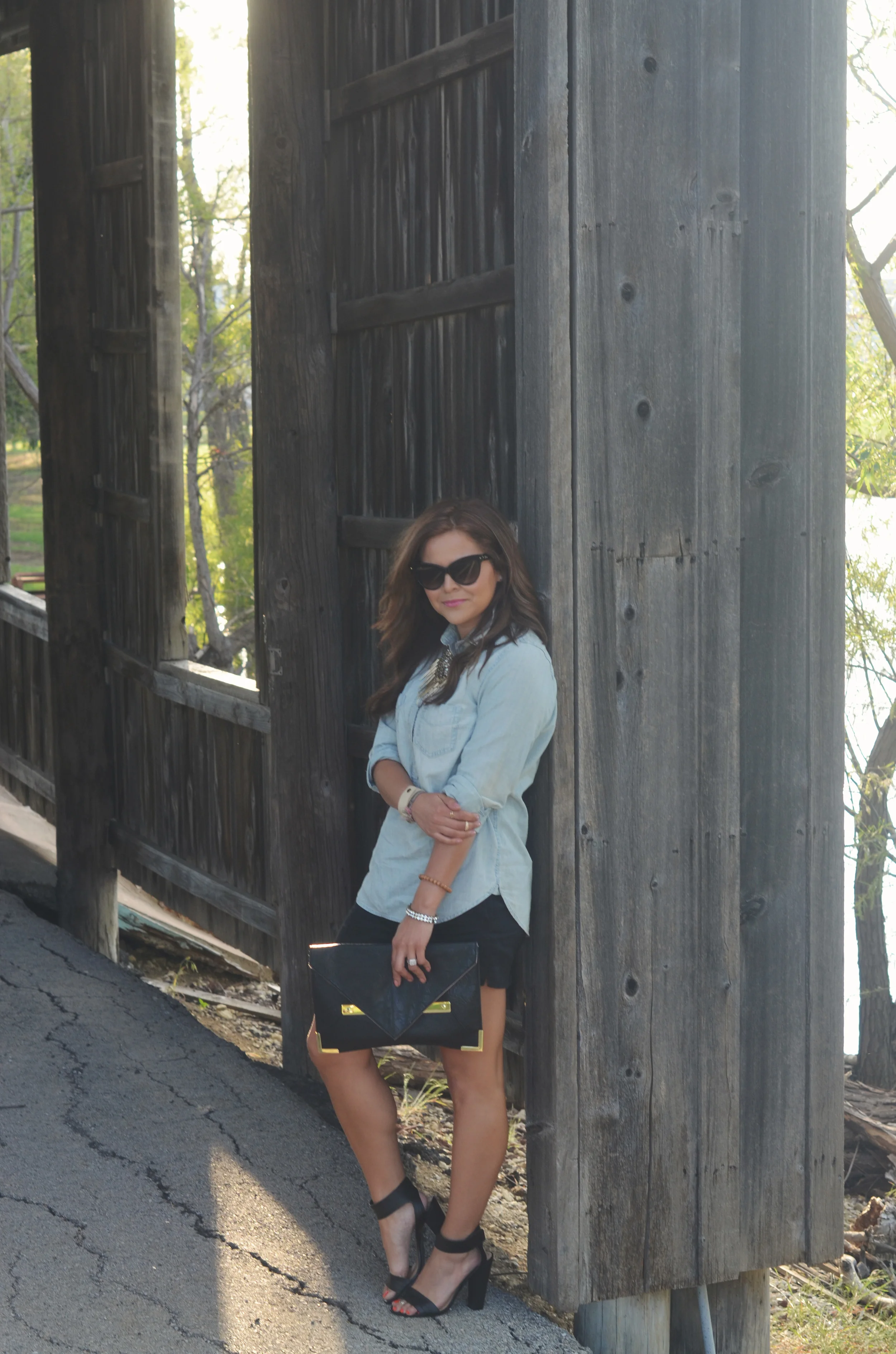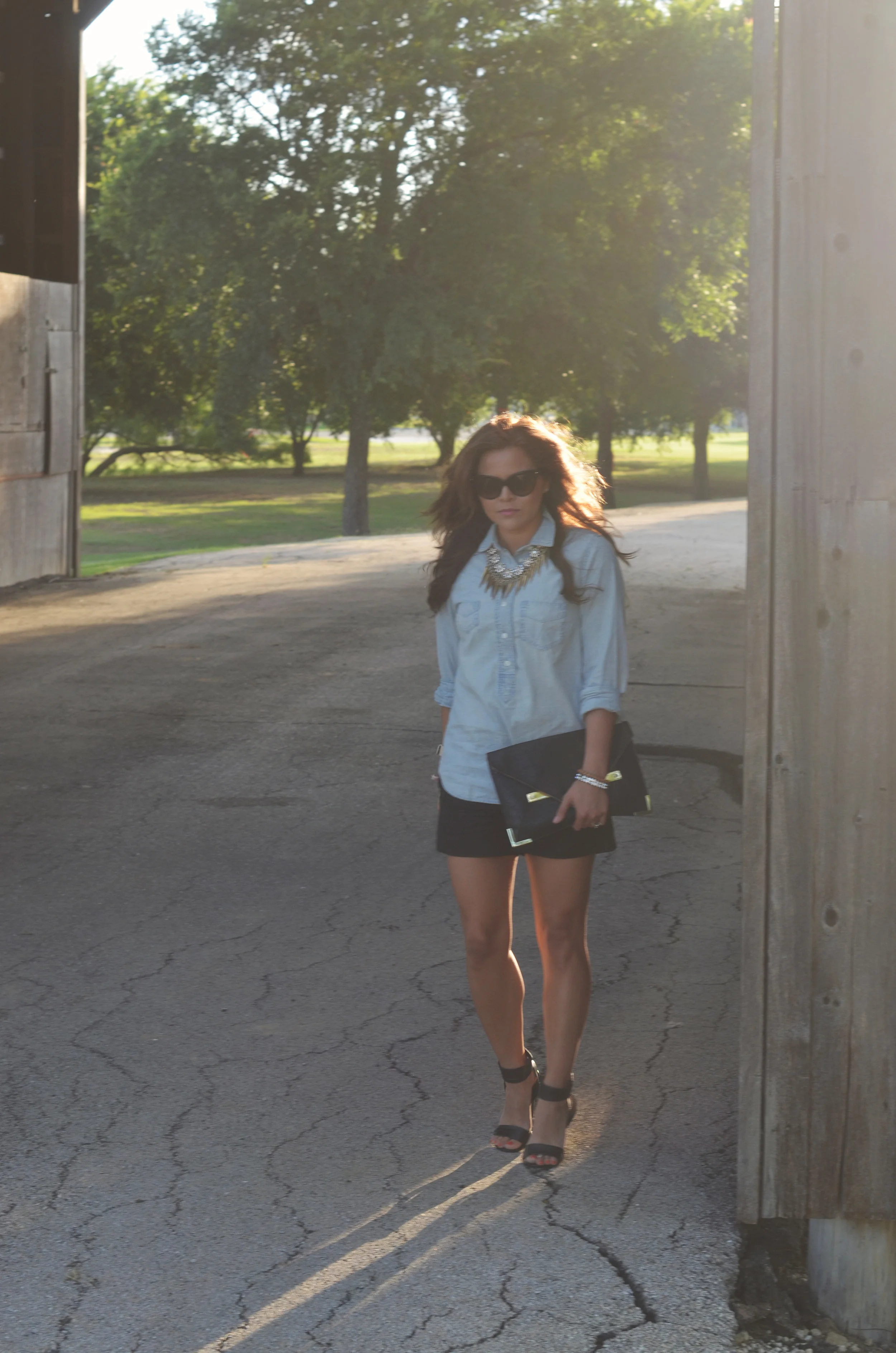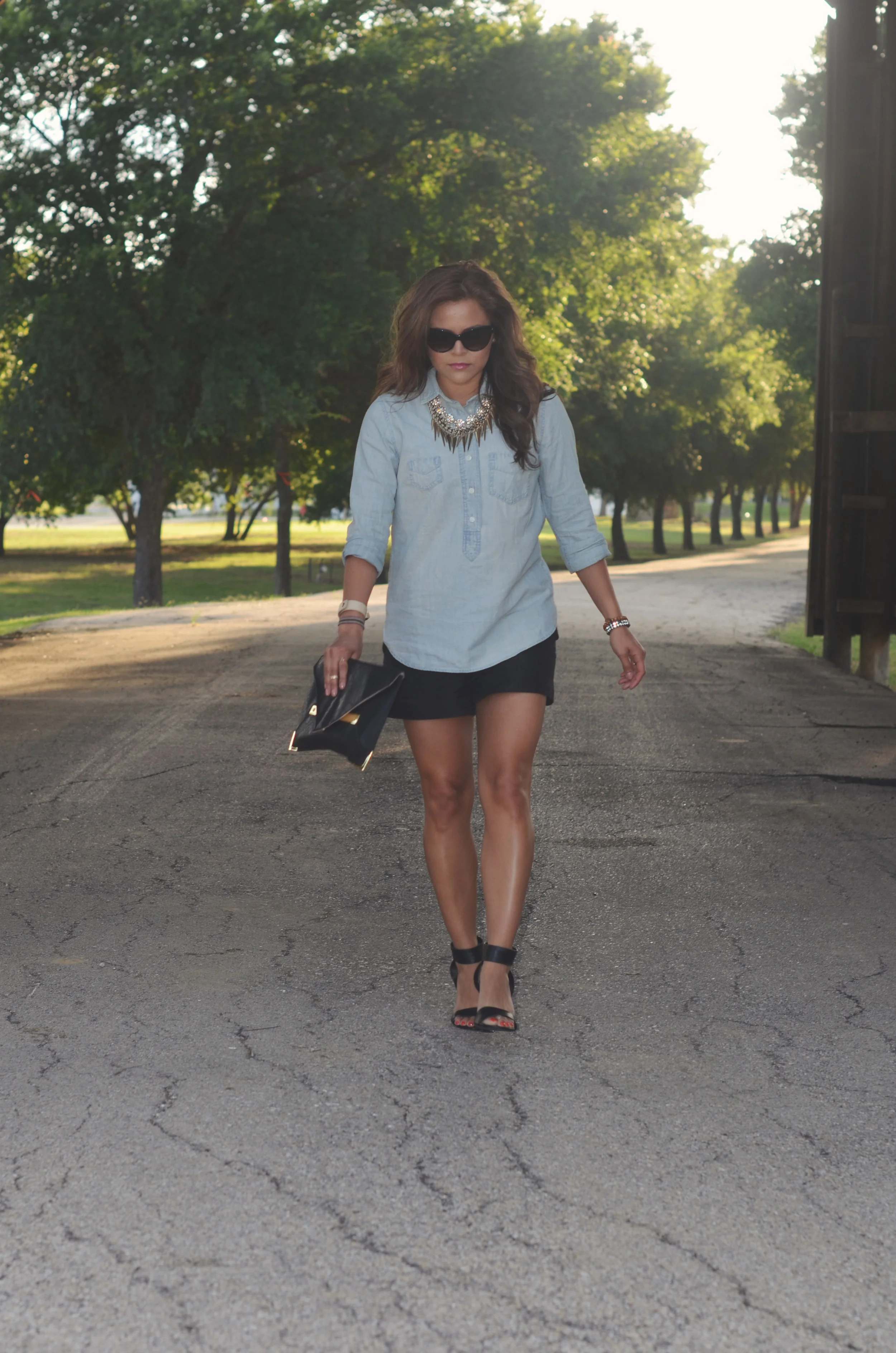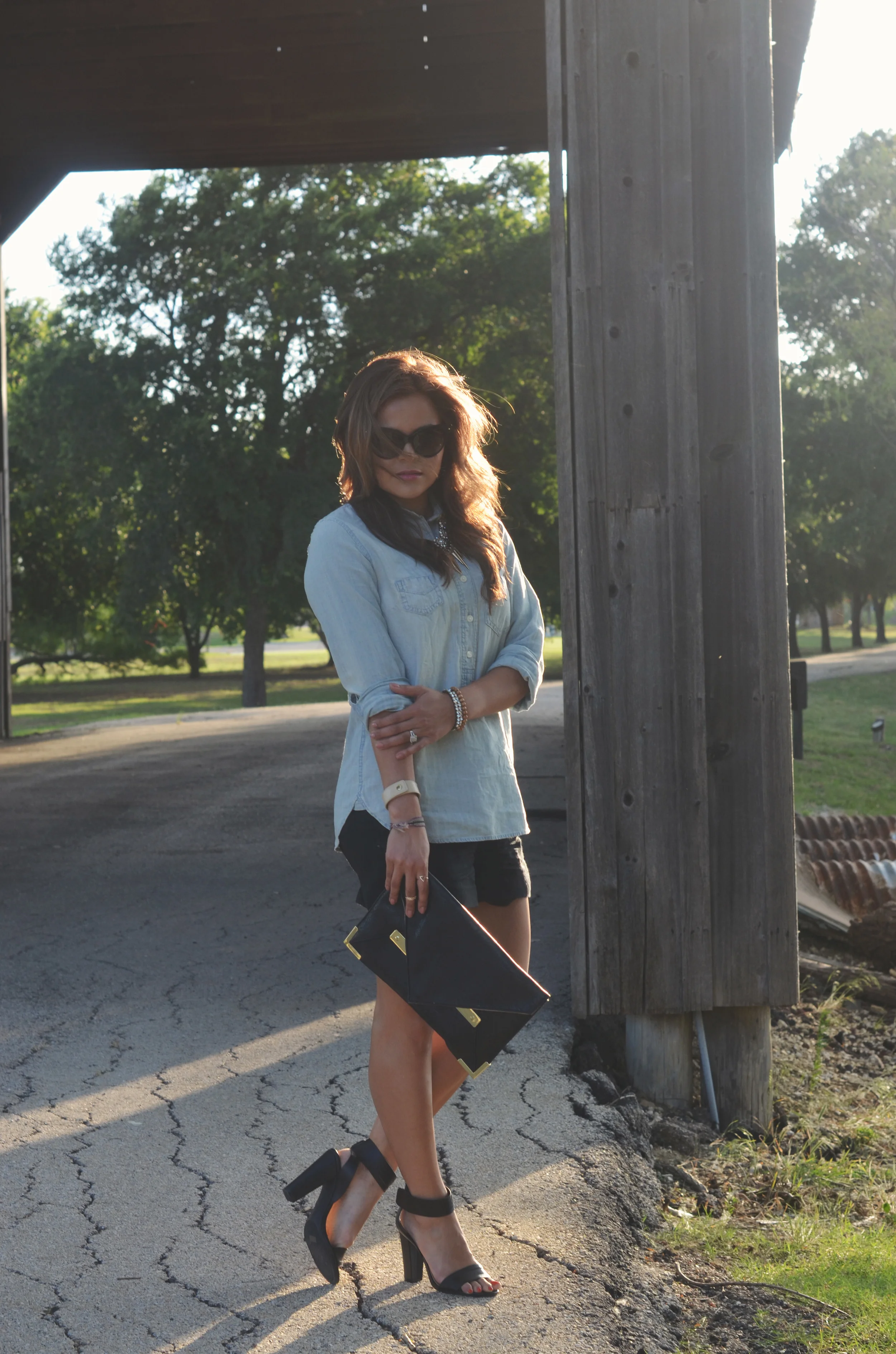 Hey, gorgeous! We all know that a chambray shirt is a must in your wardrobe. If you don't have one then go get one. You can pair it with black shorts (I chose a great pair from S.I.C. Couture - they are comfy and flowy), a cool patterned skirt, a maxi dress or skirt, or pair with a little black dress - the possibilities are endless. I chose to keep it semi-casual with some heels and super intense sunnies. This would be something I would wear on a date night or out with my girlfriends.