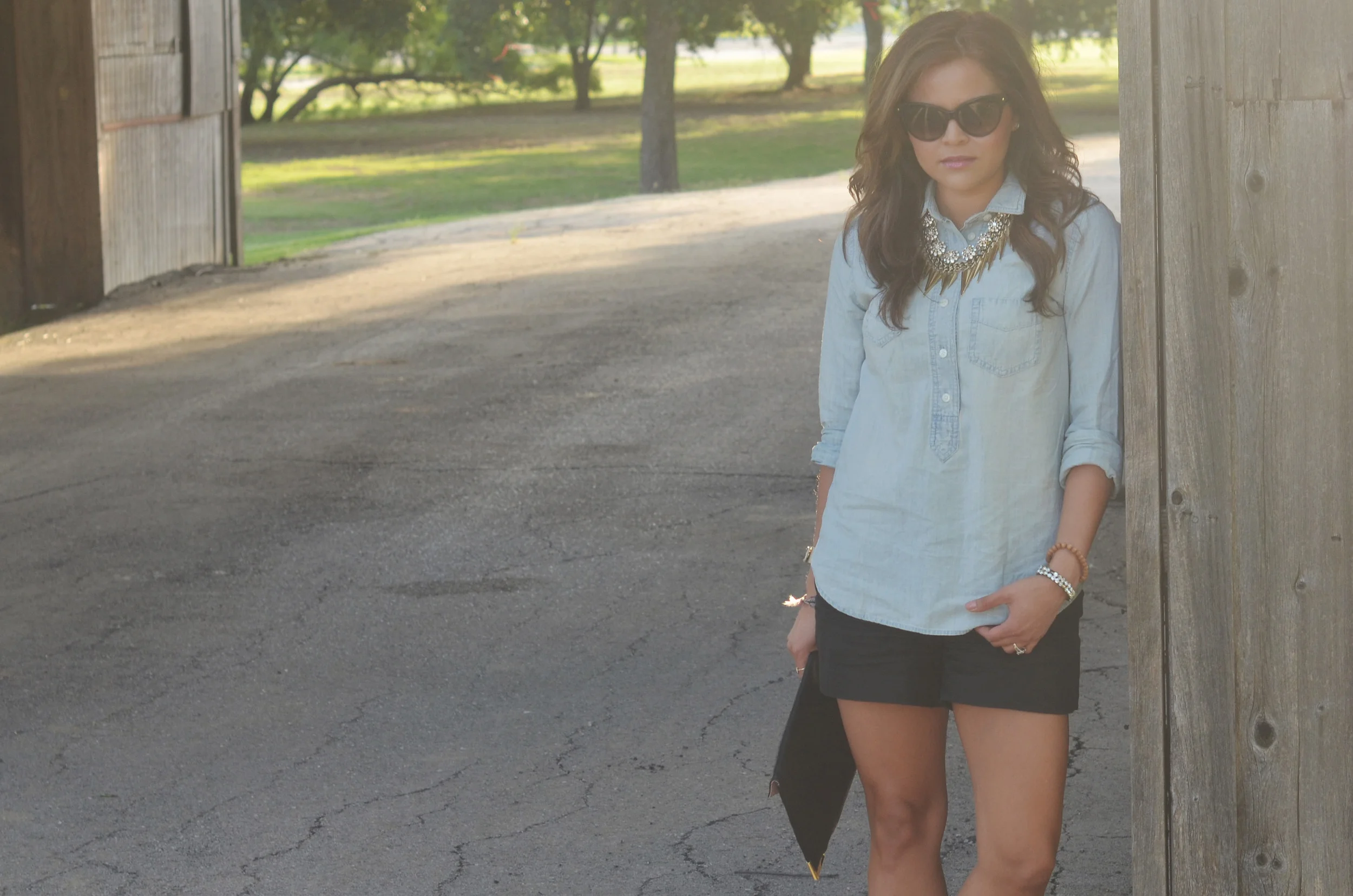 Shirt: J Crew | Shorts: S.I.C. Couture | Shoes: Lulu's | Clutch: Dorothy Perkins | Necklaces: Charming Charlie and Jewelmint | Sunnies: Christian Dior