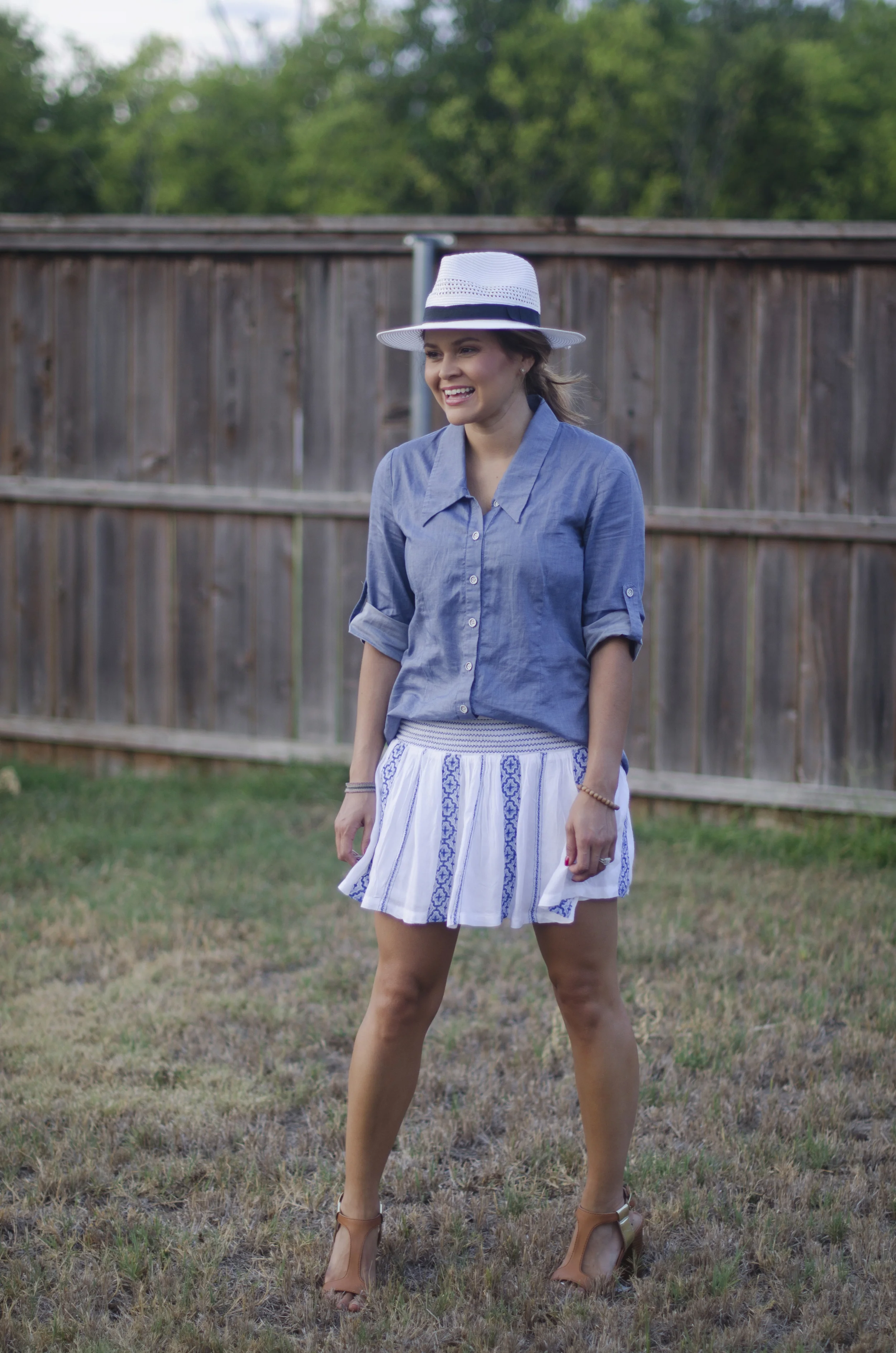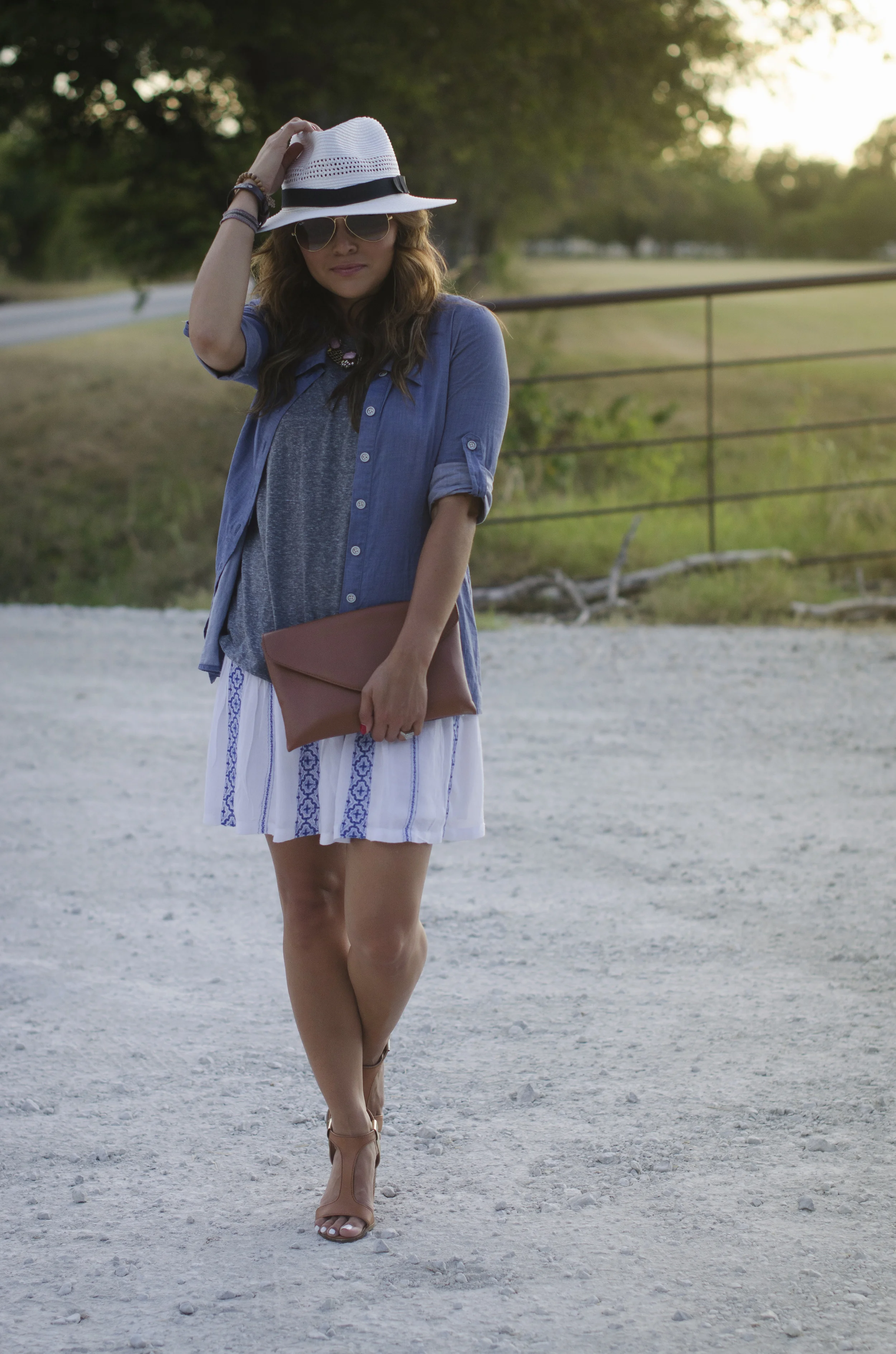 Button up: S.I.C. Couture | Shirt: Abercrombie | Skirt: Forever 21 | Shoes: Kelsi Dagger (black and silver version) | Clutch: J. Crew | Necklace: Jewelmint | Panama Hat: A gift (similar) | Sunnies: Ray-ban
