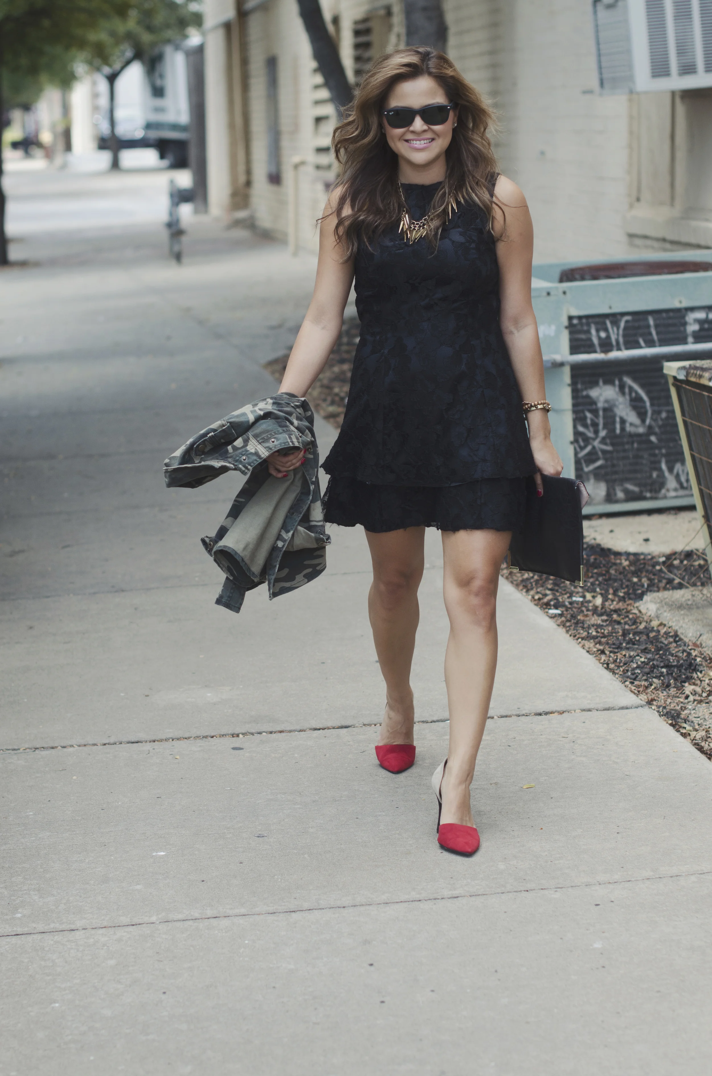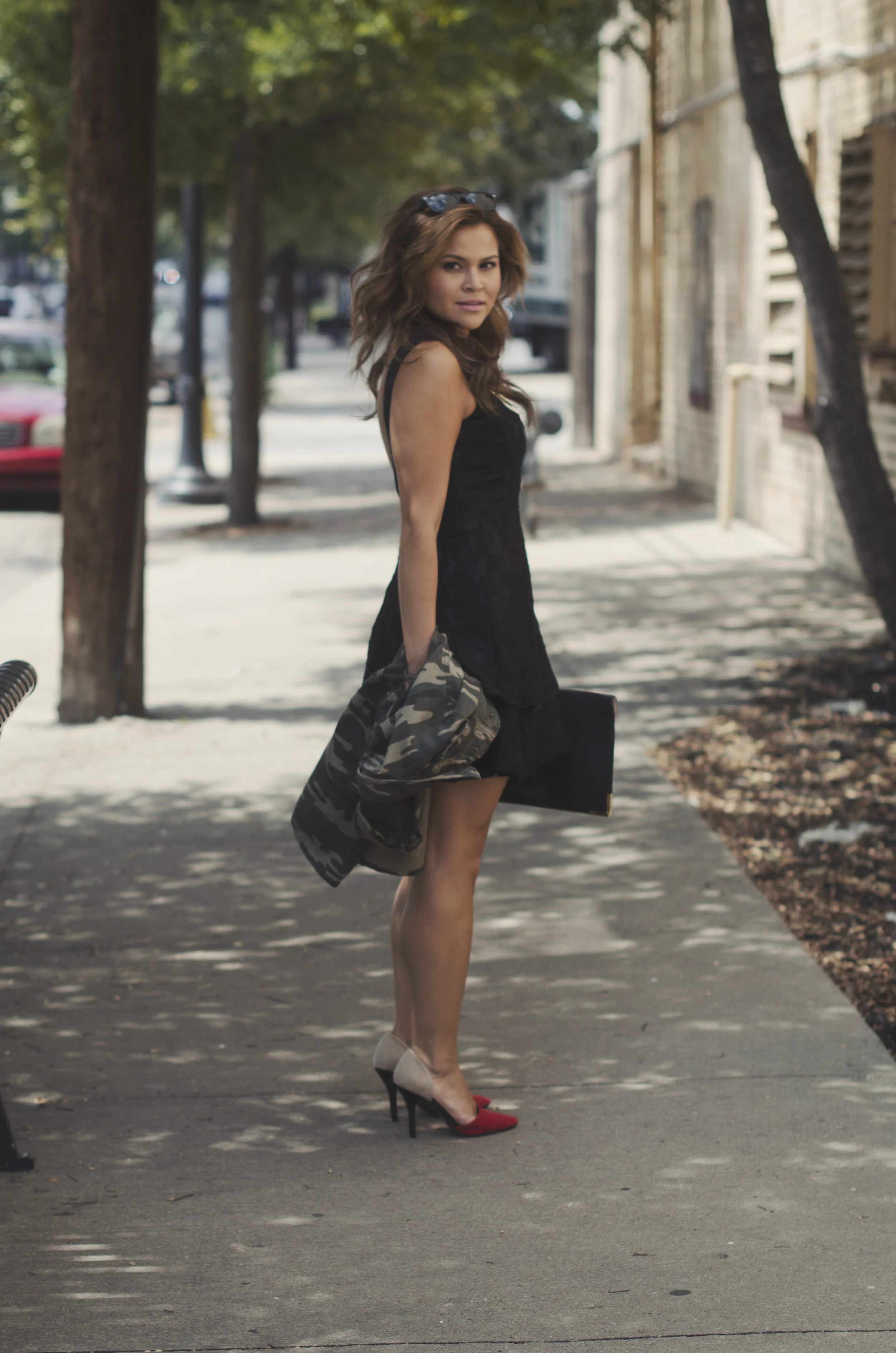Let's get into this outfit though! While summer is coming to an end we are slowly, I mean slowly getting those fall clothes out. I have been searching for a camo jacket for awhile now and low and behold, Forever 21 sucked me in. But a little camo and lace never hurt anyone, right? Spicing up this little black dress with a camo jacket gives it just enough toughness but still staying girly and sexy with a pop of red and....have you seen the back?
