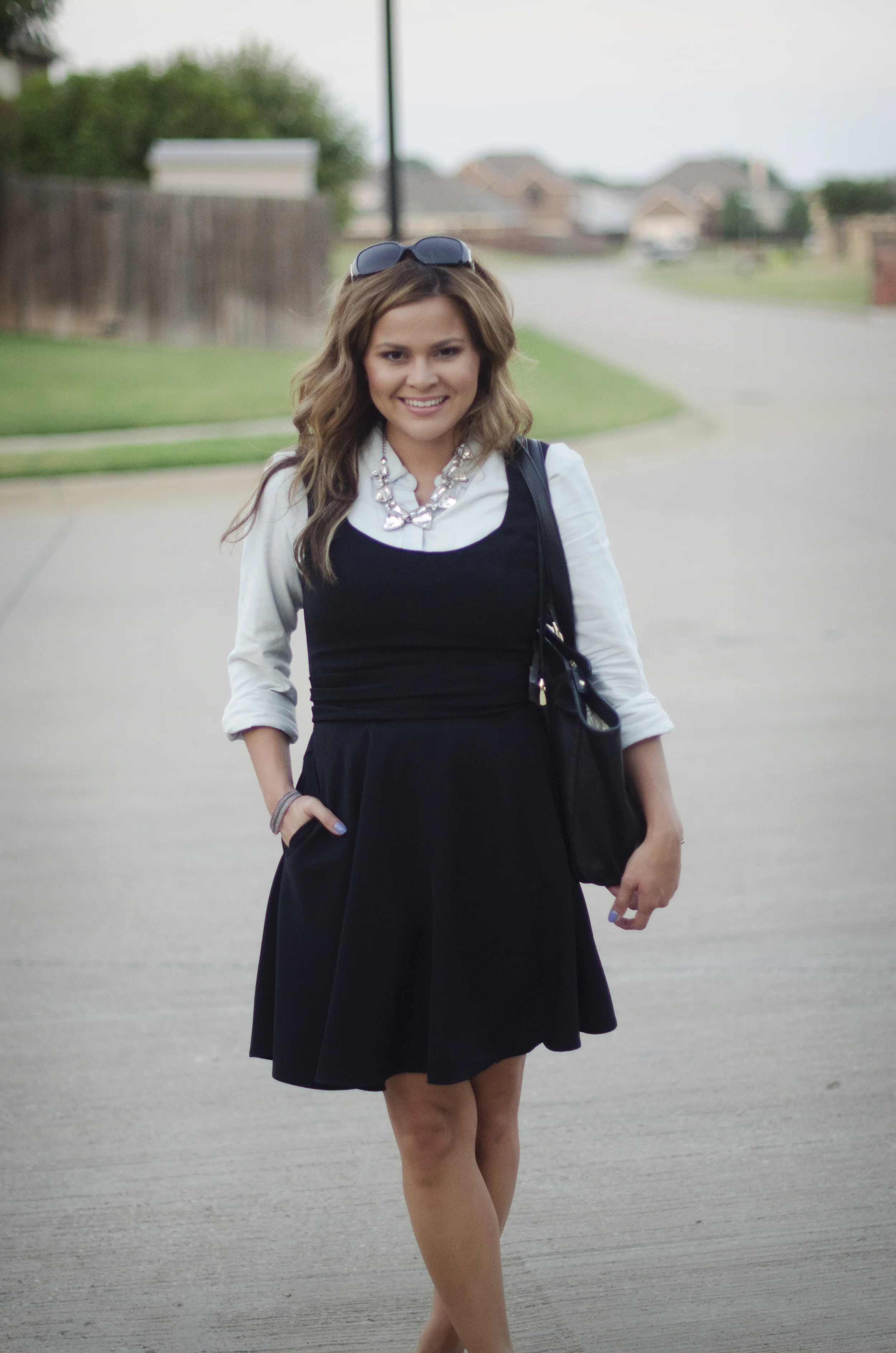 Button up: Zara (similar) | Dress: S.I.C. Couture (on sale - $49!!!) | Shoes: Shoedazzle (similar) | Necklace: Forever 21 | Bag: London Fog (love this one) | Sunnies: Fendi
