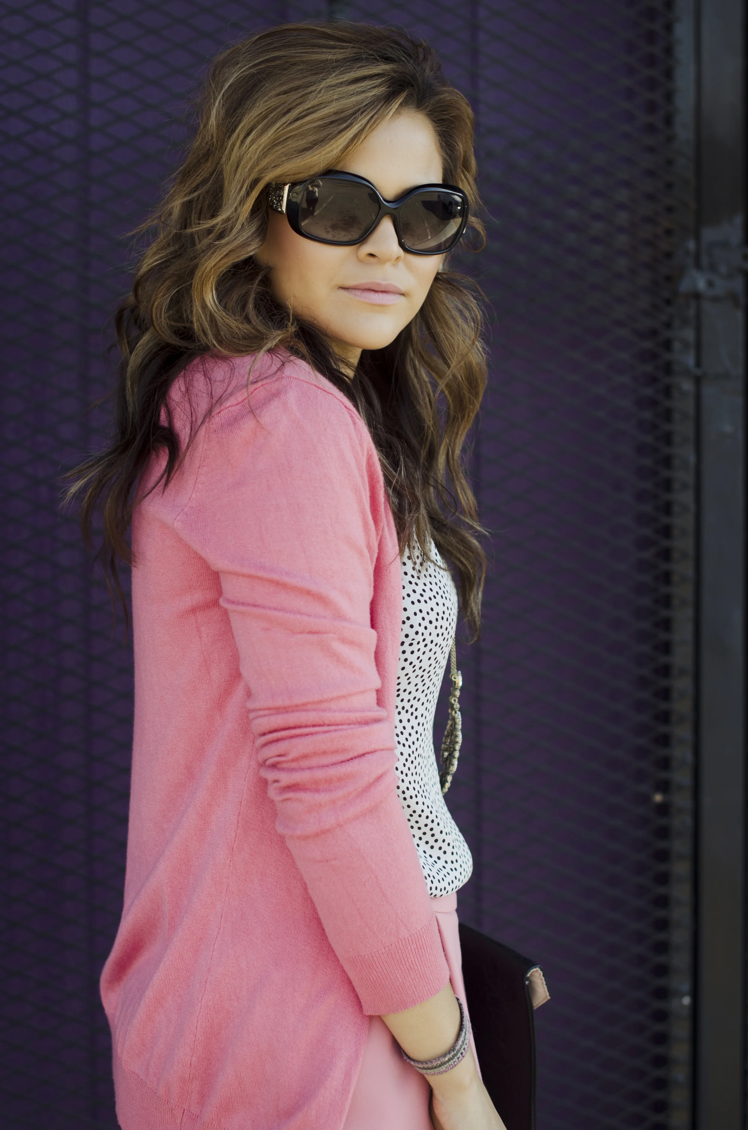 As summer comes to an end next Tuesday, officially, I had to shoot a few more summery outfits (another "summer" one is coming Monday) before fall officially starts. I love this salmon color with the splash of purple in the background and to compliment the colorful vibes, the black/white polka dot shirt helped balance out the look (even though I didn't plan to have this cool purple wall, we stumbled upon it - promise). This shirt actually has a really pretty open back but wanted to try something different so I tucked it in and added the cardigan. I was pleasantly surprised that it worked. I love pieces that can be used in unexpected ways.