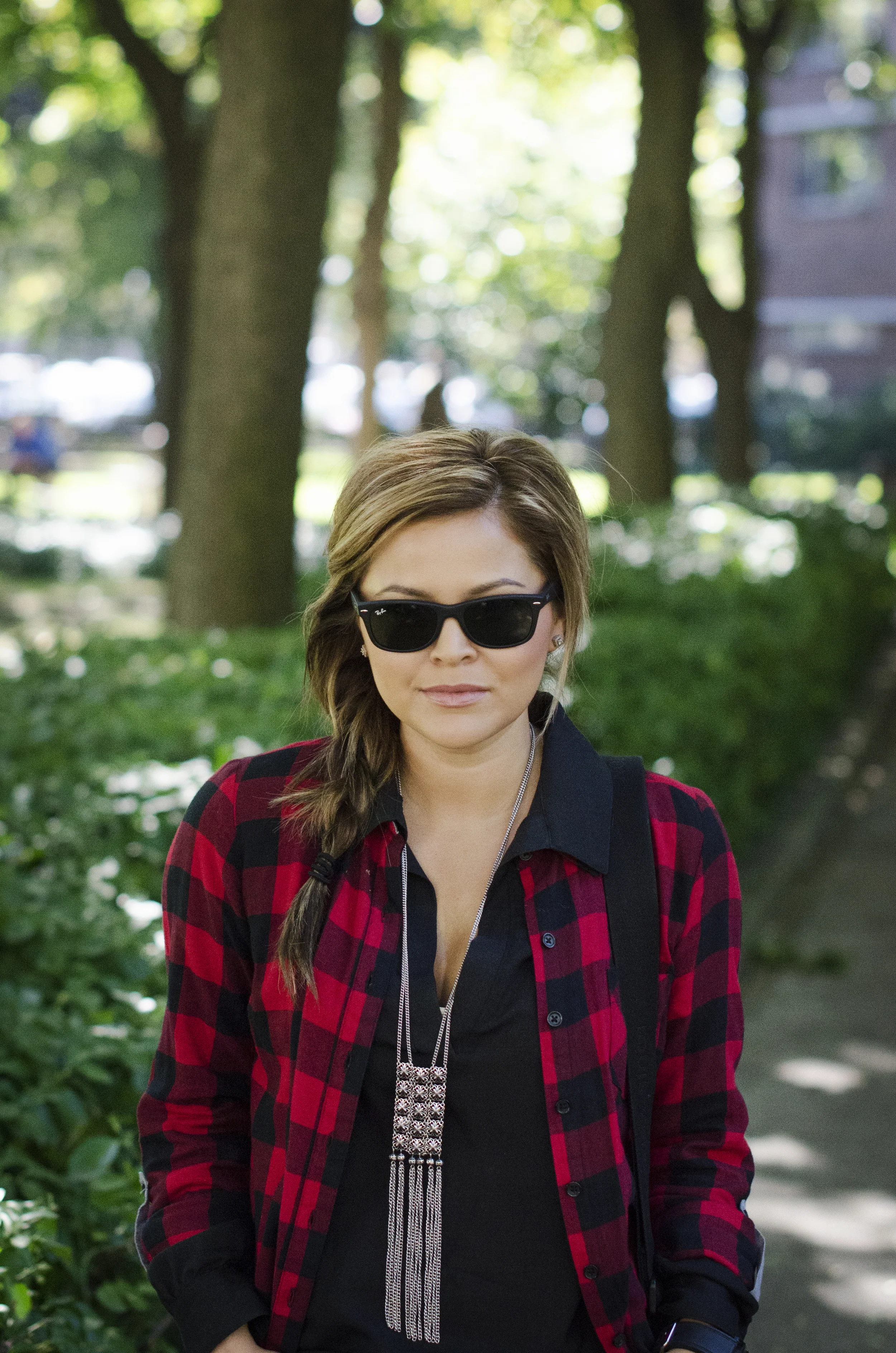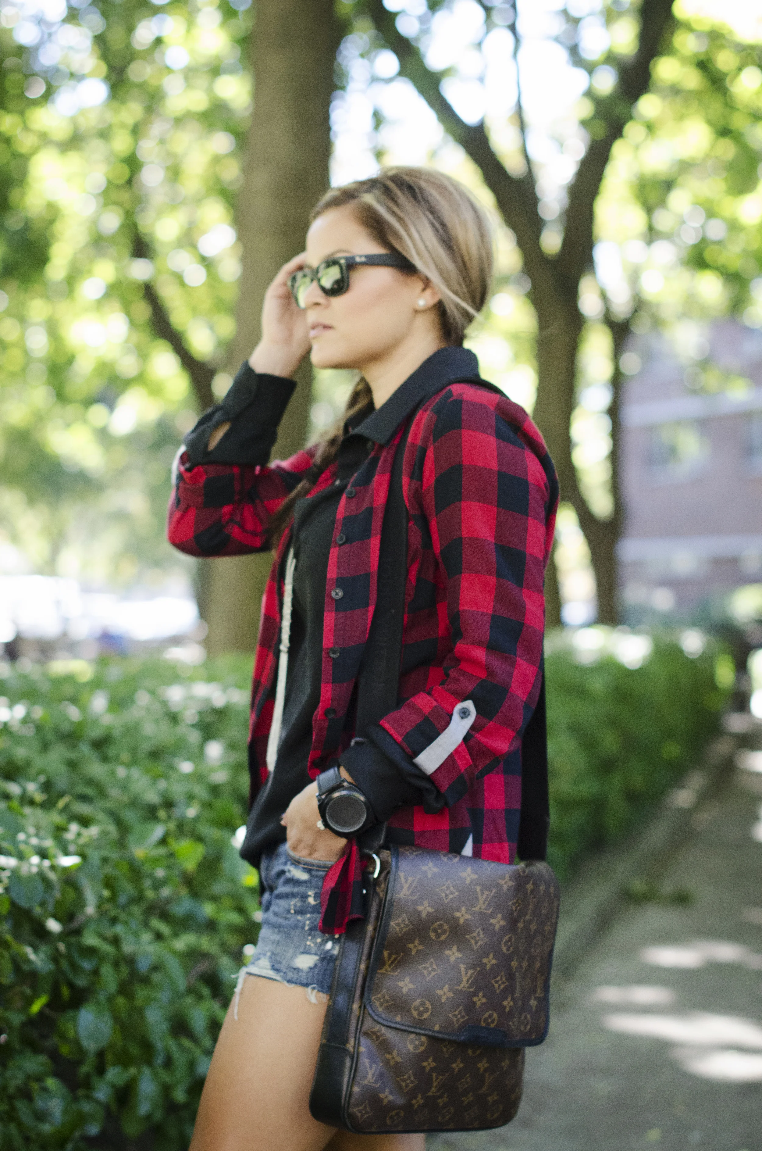 Black shirt: S.I.C. Couture | Plaid shirt: TJ Maxx find, old (similar) | Shorts: Abercrombie, old | Necklace: Forever 21, sold out (similar) | Bag: Louis Vuitton | Shoes: Vans | Sunnies: Ray-ban