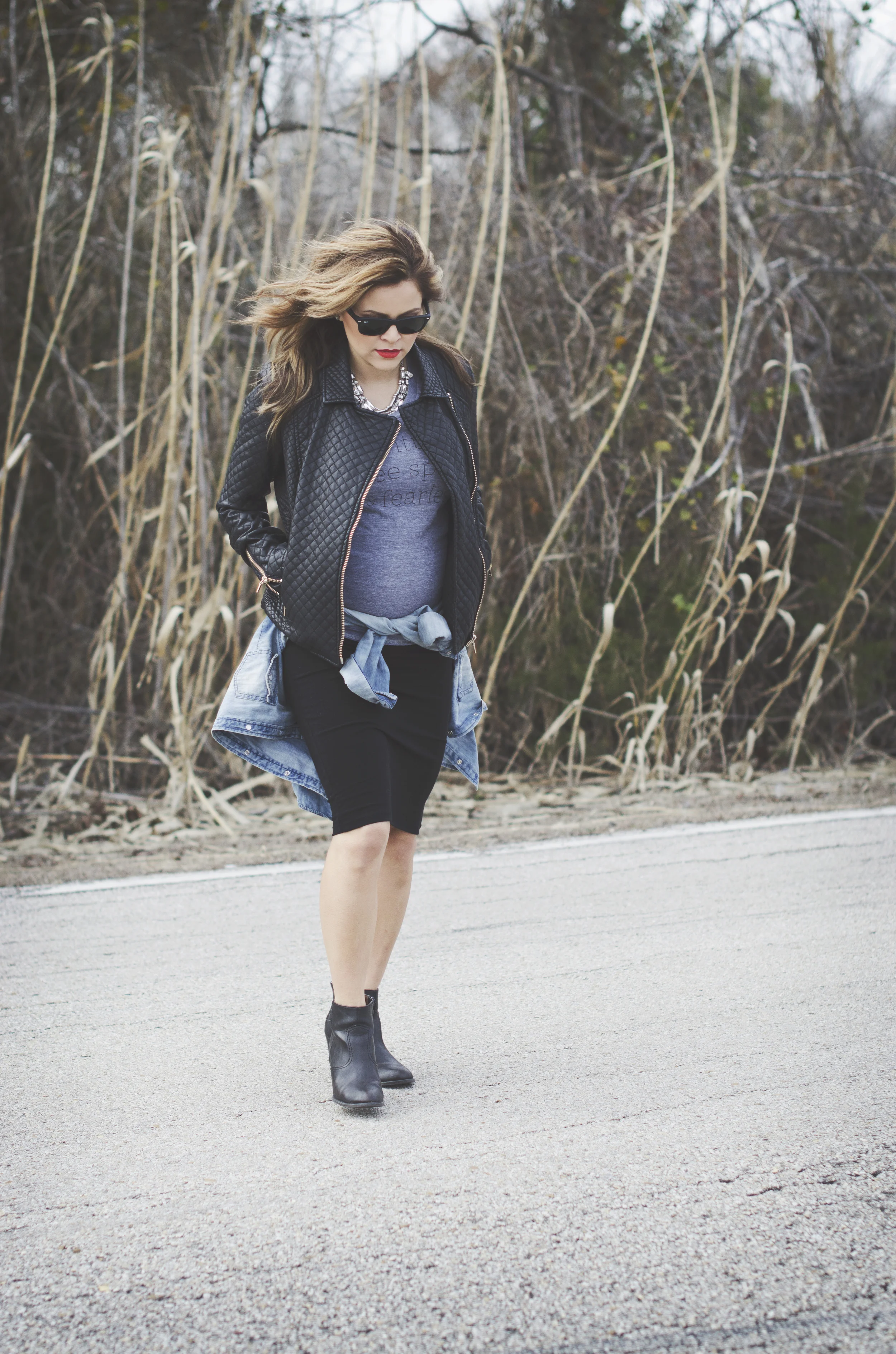 I'm not a form-fitted clothing kind of gal, I like flowiness in my wardrobe but I know as I get bigger stretchier items will become my best friend. I found this skirt a while back at Forever 21 and knew it would come in handy when my current wardrobe would become a little snug. Plus I could wear post-pregnancy. Sold for $8.90! A basic knit skirt with a t-shirt, faux leather jacket and booties. And boom! You got a good basic outfit. I'll take it!