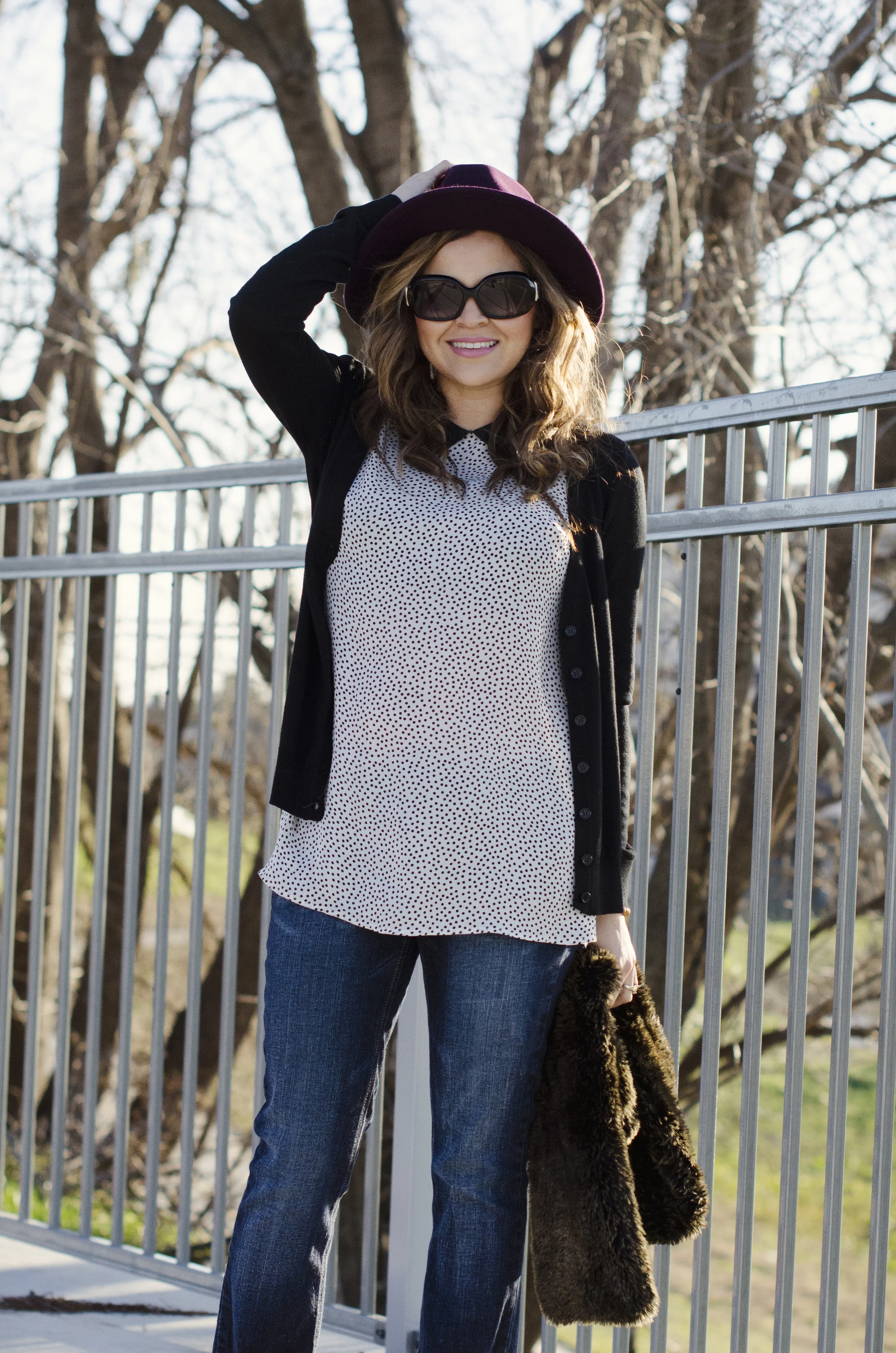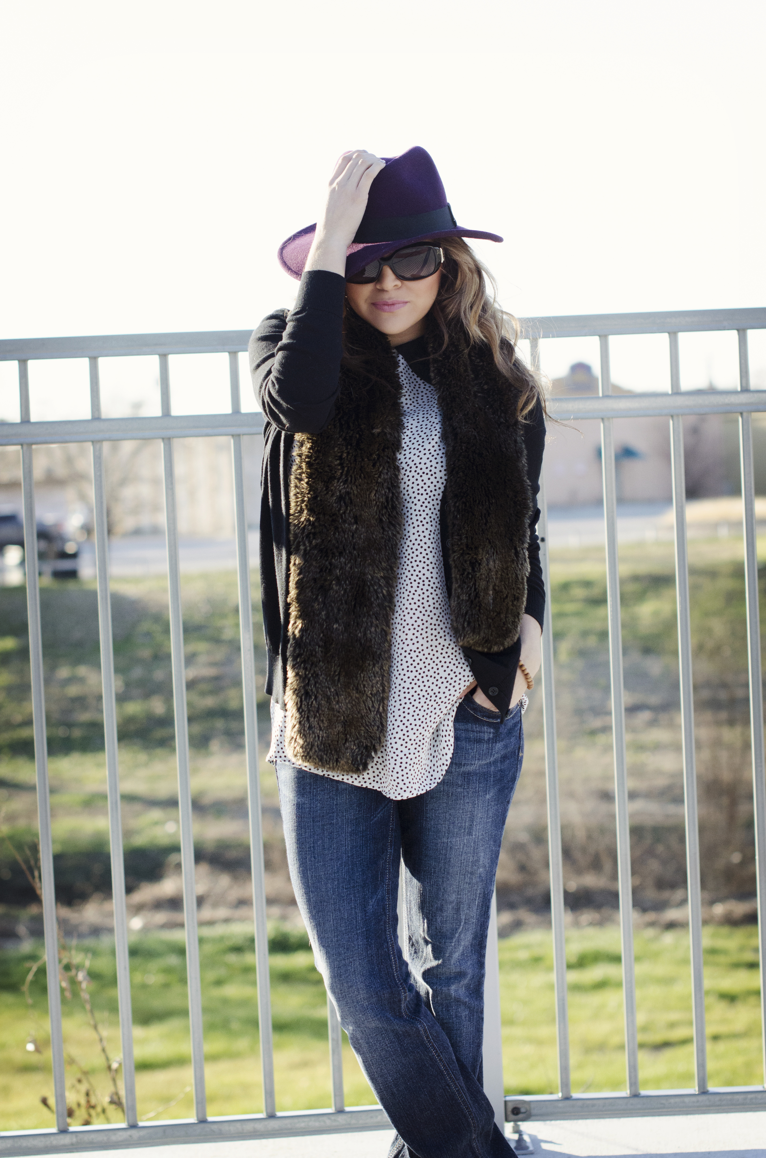 Blouse: S.I.C. Couture | Cardigan: Forever 21 (simliar) | Jeans: Guess | Shoes: Steve Madden (simliar) | Hat: H&M | Sunnies: Fendi | Faux Fur Scarf: Restoration Hardware