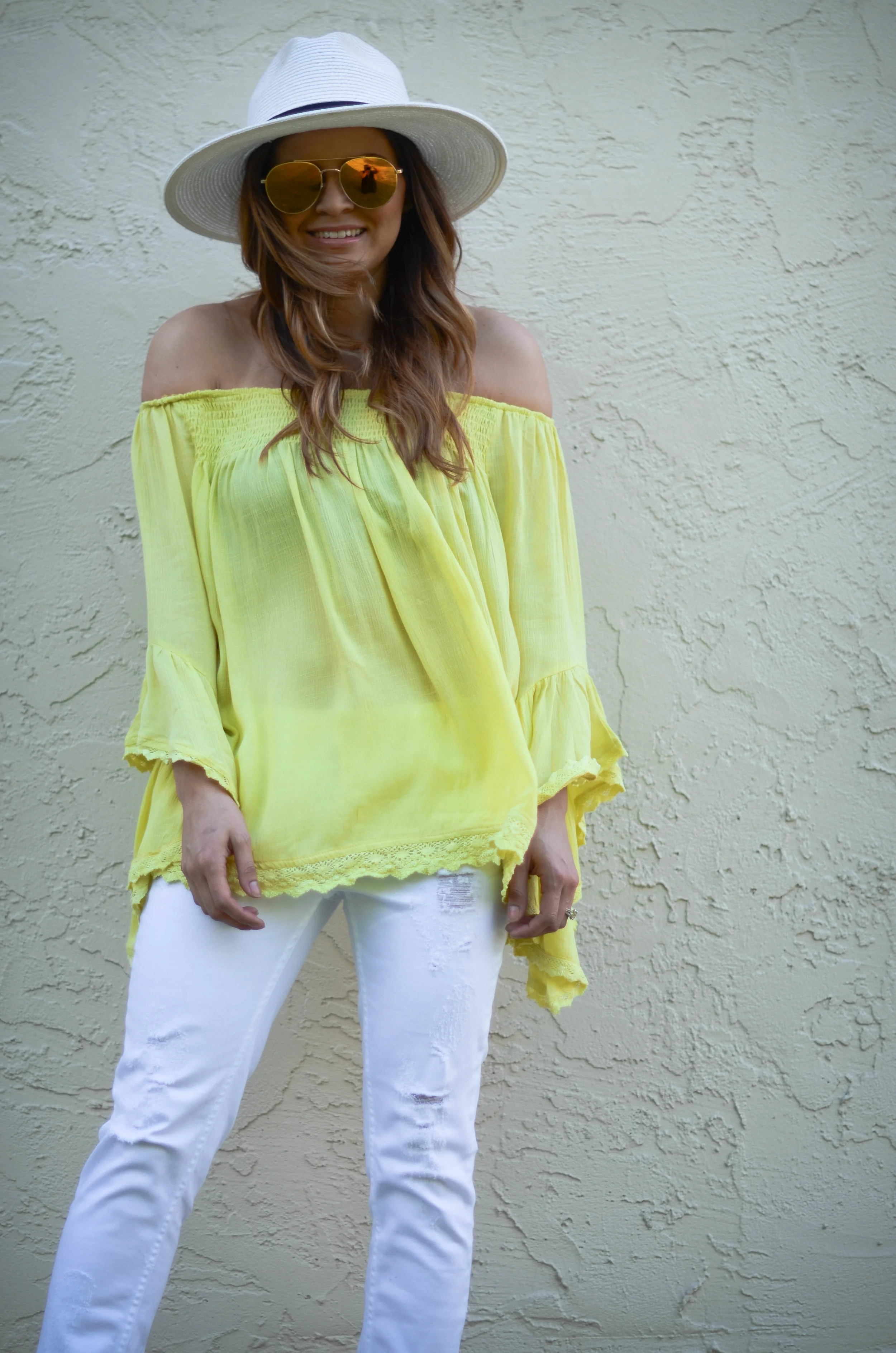 Happy Thursday! A quick outfit post that we shot last week with this new top we got in at S.I.C. Couture. It's super lightweight and perfect for the summer heat. Don't be scared about the color, it's a gorgeous chartreuse and will go with any skin tones. Show them bronze shoulders, girl!