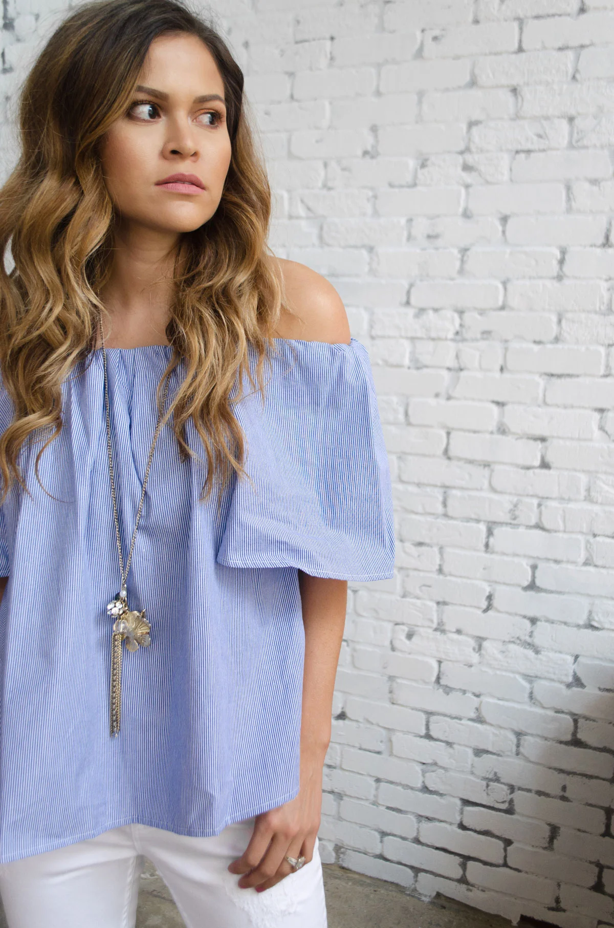 I styled this top 2 ways - tucked out, which would be anyone's 1st thought to do when putting it on. Super casual, perfect for brunch or drinks with the gals, whatever the weekend brings you. Pretty easy and effortless. Then I decided to tuck in but change to denim jeans and add a belt to break the "blue" up. This one is a bit more polished, in my opinion. Definitely more for a night time look. These two looks are good for spring, summer, and fall with an easy change with just your shoes.