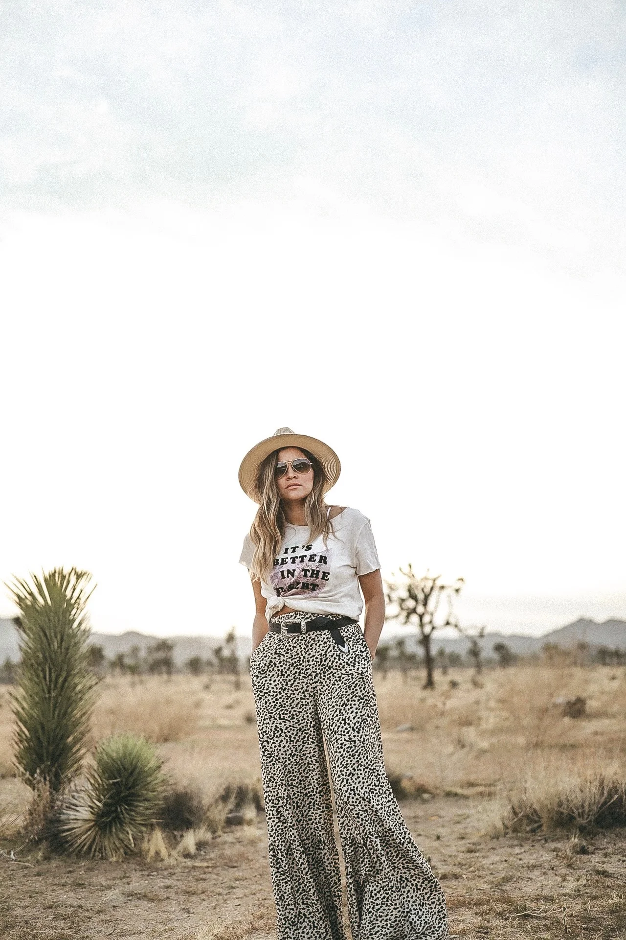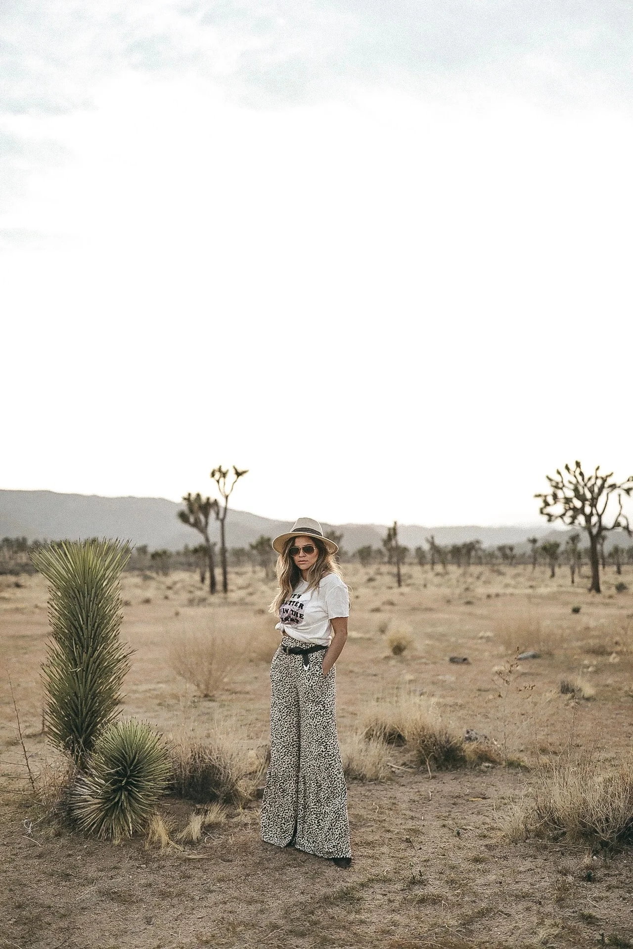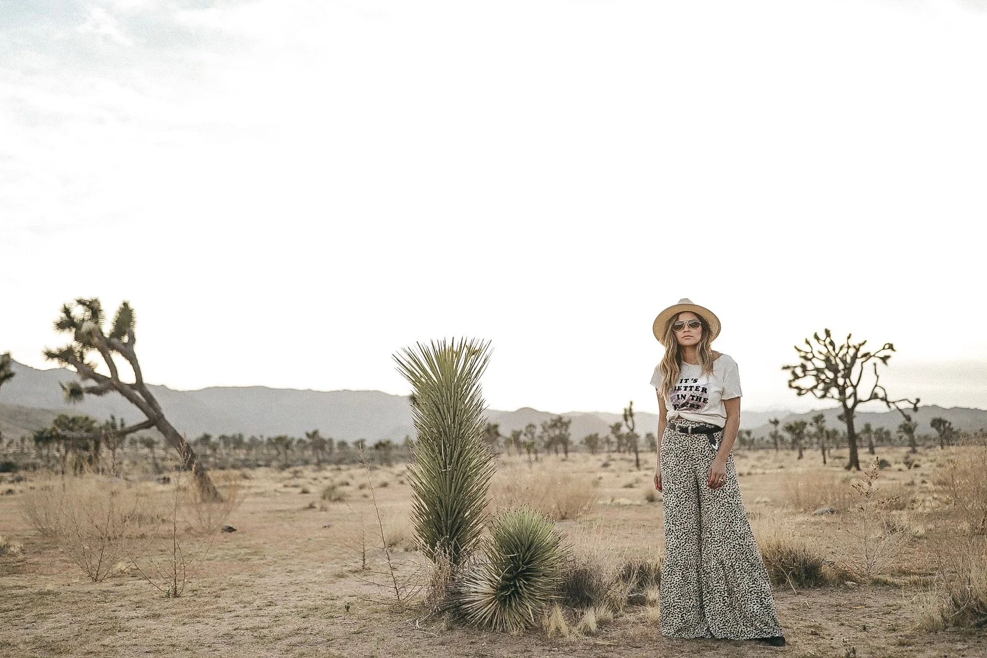 This was actually the second look we shot which was amongst scattered Joshua Trees. I found this shirt prior to our trip and it says "Better in the Desert"... and I knew I had to grab it for the trip! I paired it with some of the most comfiest pants I've ever had. They feel like pajamas pants! I probably would wear them to bed. :) I love the wide leg and subtle ruffle detail on the legs. Gave the pants an interesting look! AND the have pockets!!!