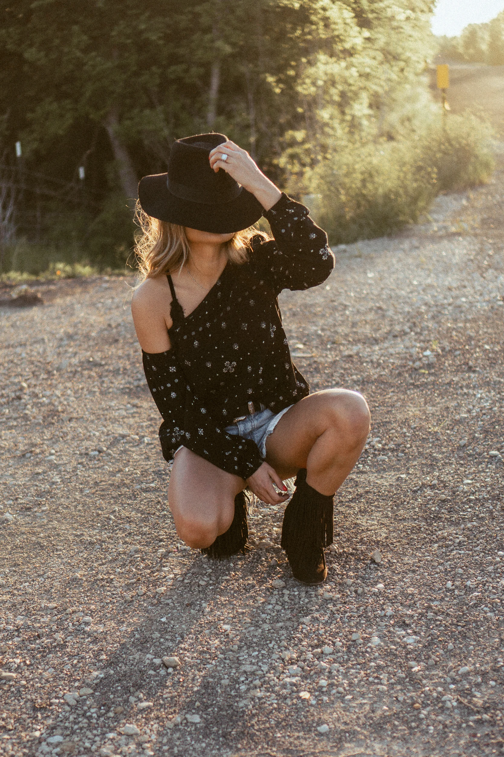 One shoulder top | Denim shorts (similar here and here) | Boots, old (similar here and here) | Wool hat (similar here and here) | Bralette (similar here and here) | Western Belt