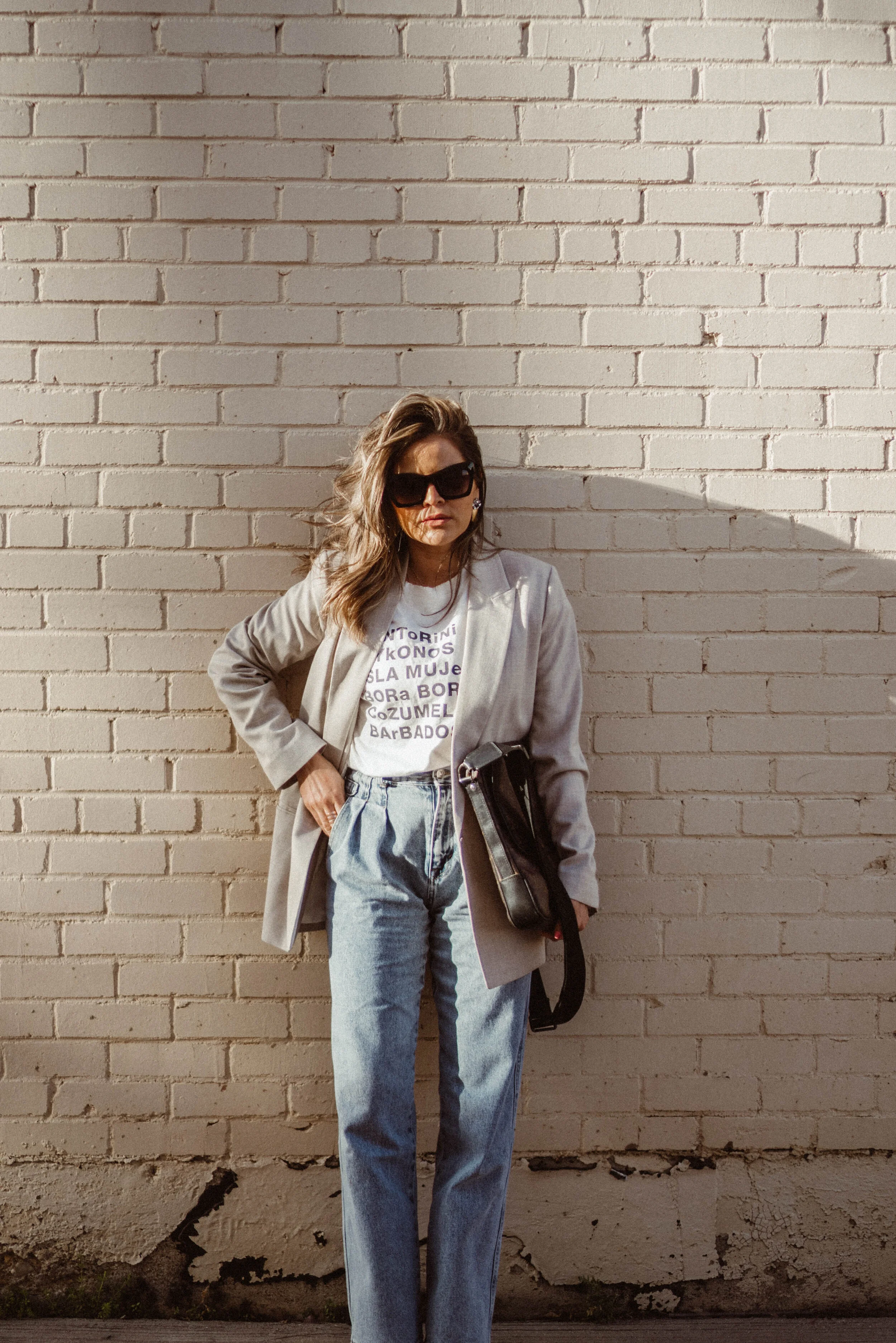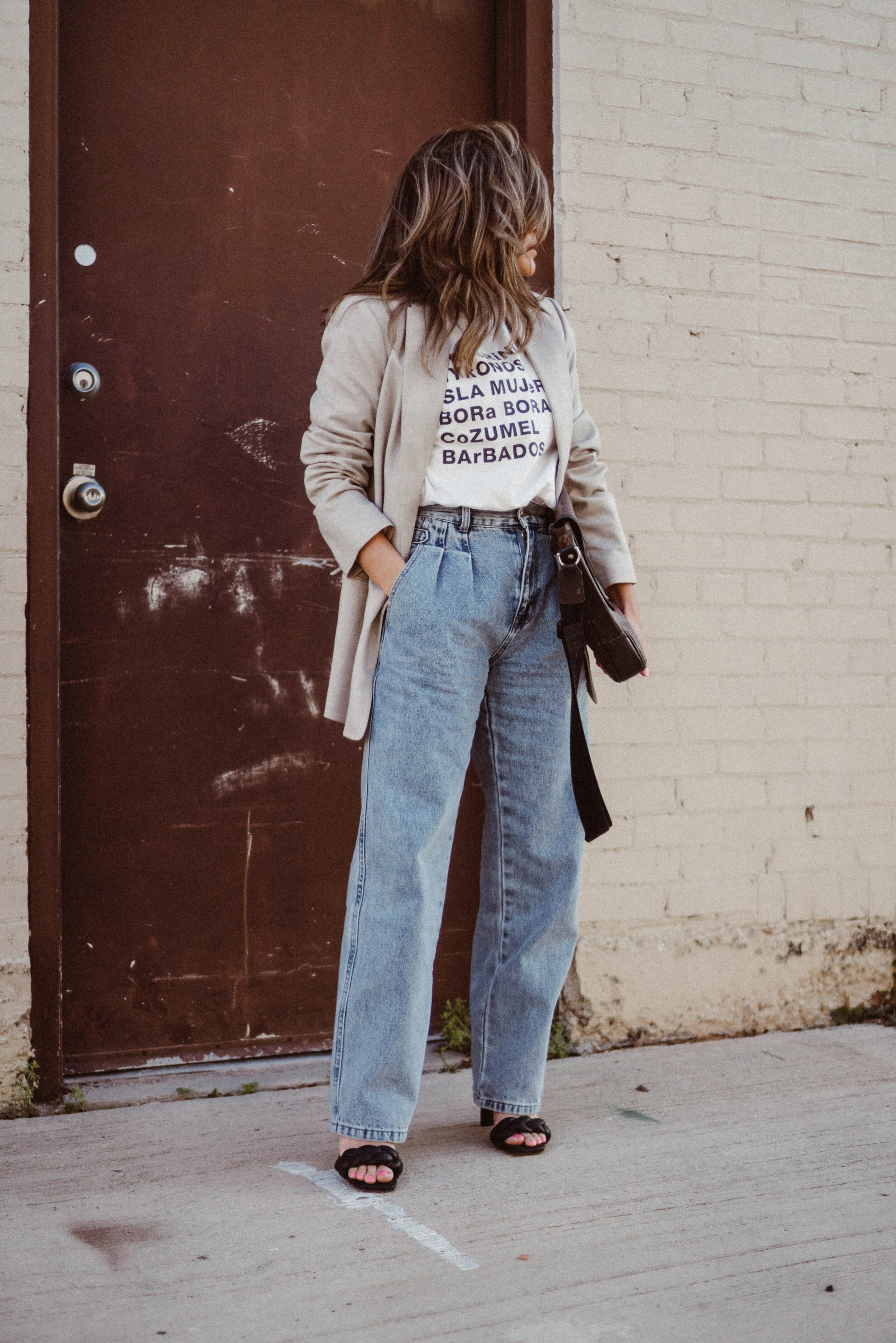 Let’s get down to business. Have y’all heard that song from Tiesto? It’s super catchy. My husband actually told me about this song. Makes me think of summer and being in a social setting. Ahh the good old days. I did a fun reel on instagram with that song, I will link that below. Anyhow, let’s talk about these jeans. I love them!!! They are high-waisted and give a 90’s vibe AND are super comfortable and flattering. I like the pleated front and the detail buckle on both sides. Side note, they definitely look better with heels unless you are taller than me (I’m coming in at around 5’0’’, shorty I know). I wanted a laid back sort of 90’s dad vibe so I paired with an old graphic tee I got last year and this oversized blazer that I scored for like 12 bucks at H&M last year. I know the tee and blazer are out of stock but will link similar items below. Hope y’all have a great day! xx- jess